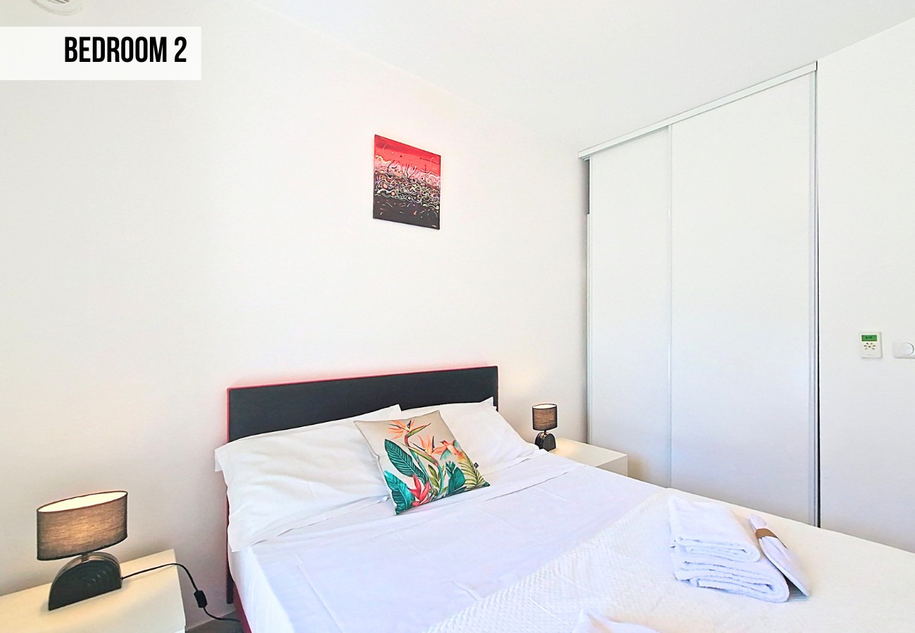 The apartment consists of a pleasant, bright living room with a fully equipped open-plan kitchen. It has a first bedroom with a double bed, as well as a second bedroom with a queen-size bed and storage space. The living room and both bedrooms offer direct access to a beautiful south-facing terrace, ideal for enjoying the Nice sunshine.