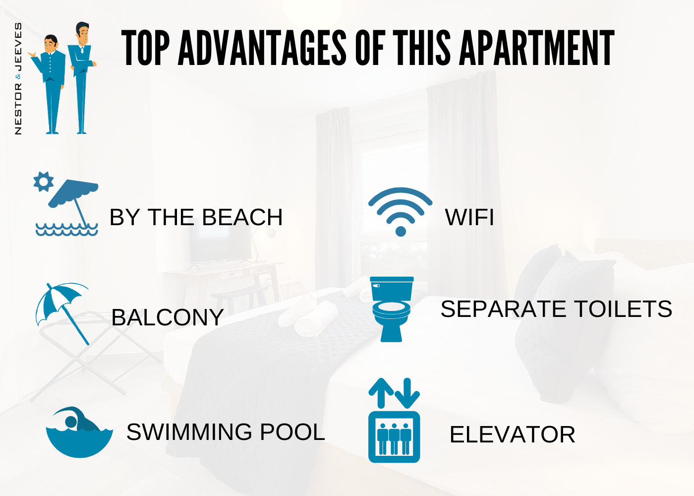 Location of the Apartment is fabulous with views over the Mediterranean and close to excellent local amenities. The booking of the Apartment, key pick up and return and service from Nestor and Jeeves was excellent.