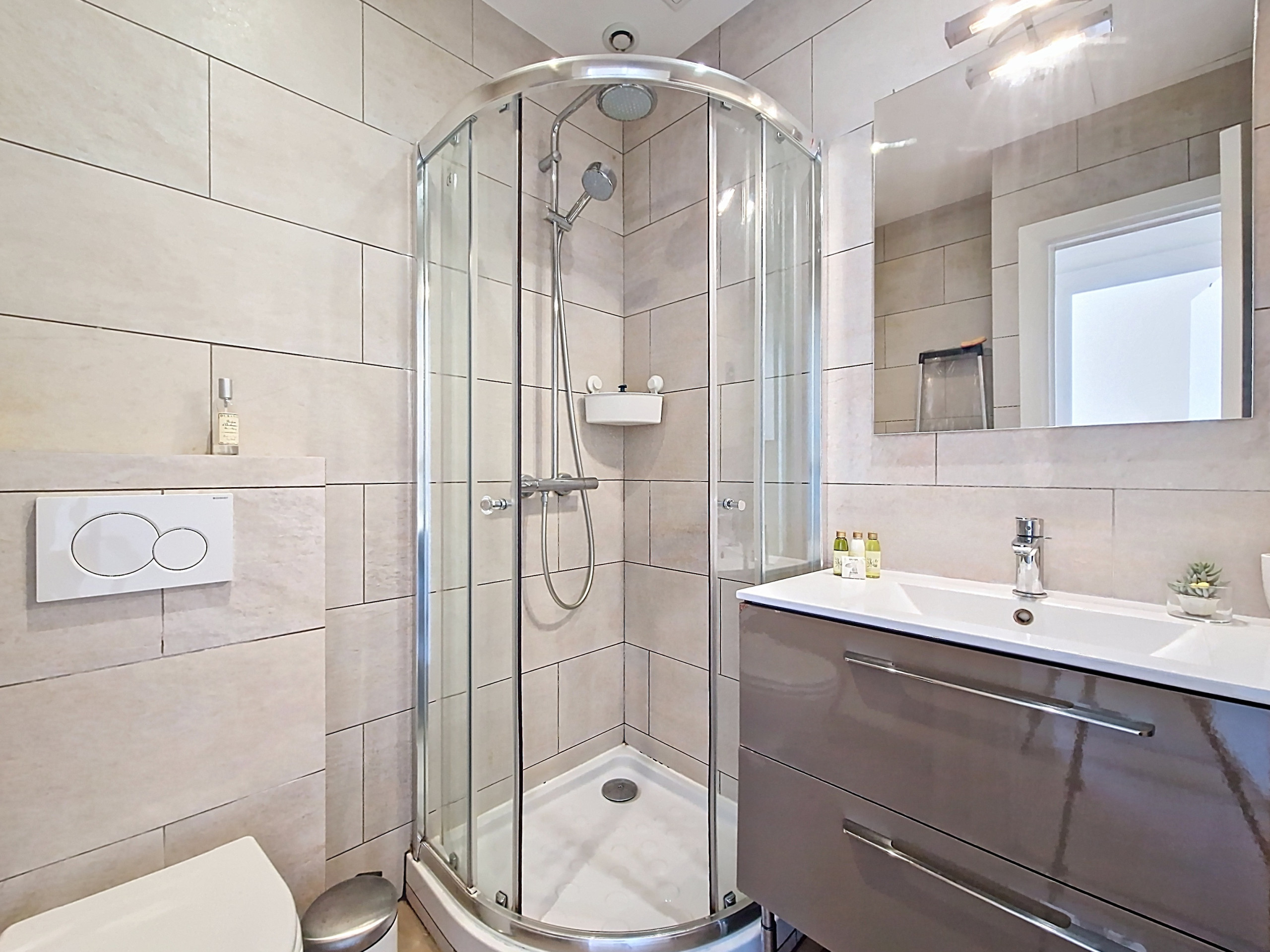 La salle de bain propose une agréable douche, un sèche-serviettes, un sèche-cheveux ainsi que des WC.