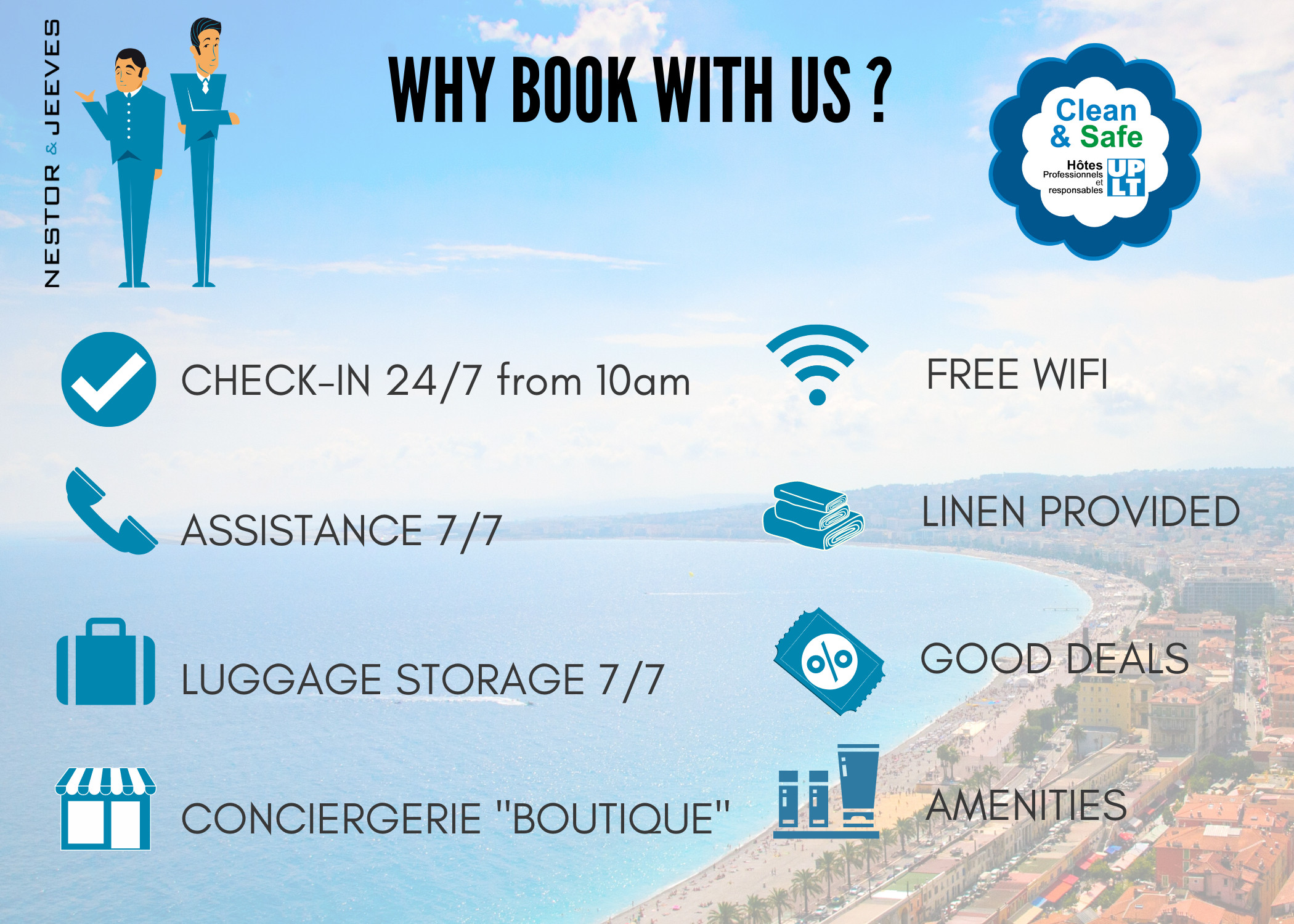 La Conciergerie « boutique » Nestor & Jeeves située dans le centre de Nice sera présente pour vous accompagner pendant toute la durée de votre séjour.