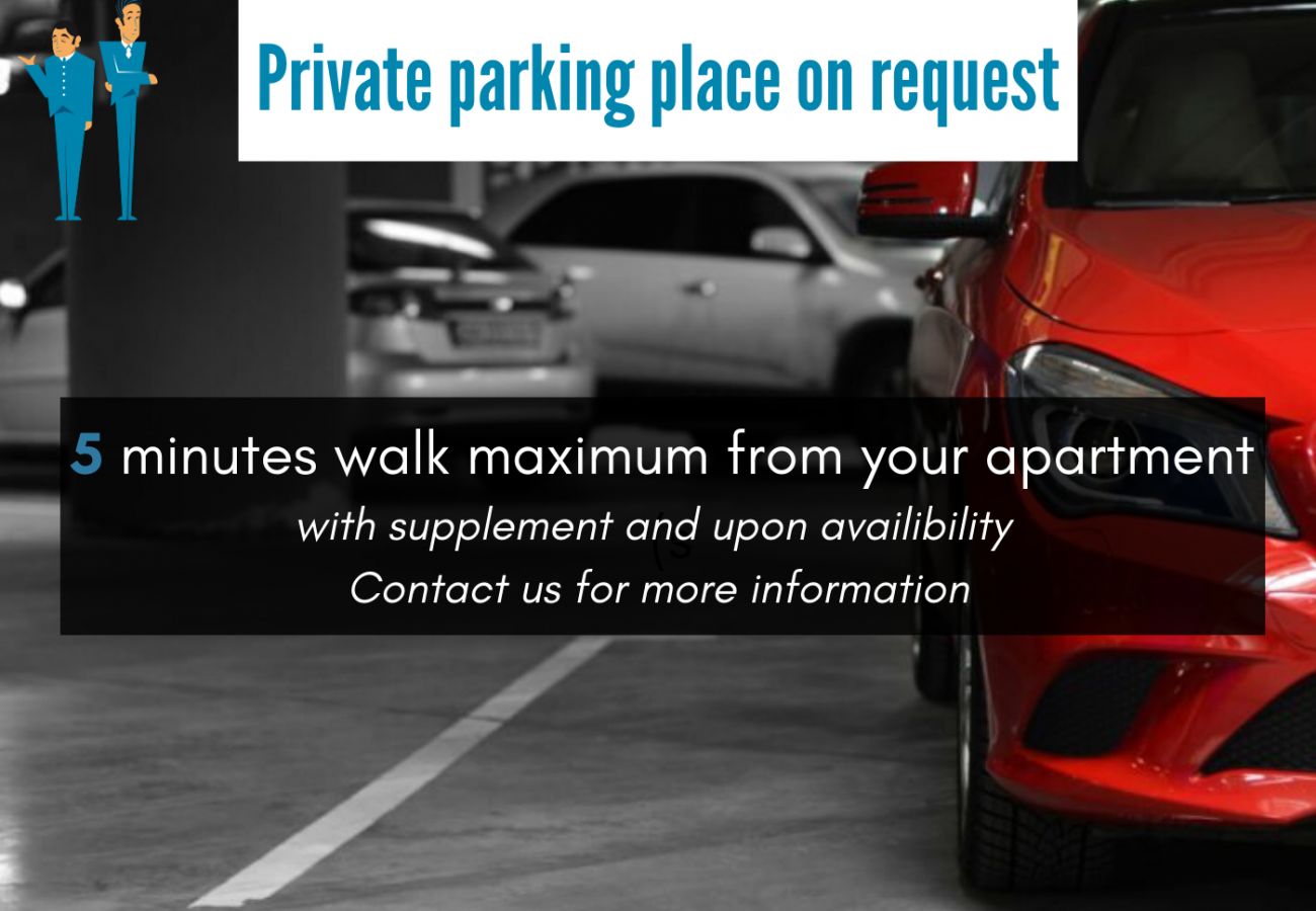 Sur demande, nous pouvons vous proposer une place de parking privé dans un rayon de 5 minutes à pied de votre appartement (avec supplément et selon disponibilité).