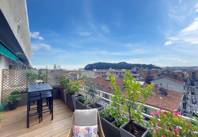 SUN DECK TERRACE est un superbe appartement de deux chambres bénéficiant d'une magnifique terrasse en dernier étage et une vue dégagée sur la ville de Nice et ses collines.