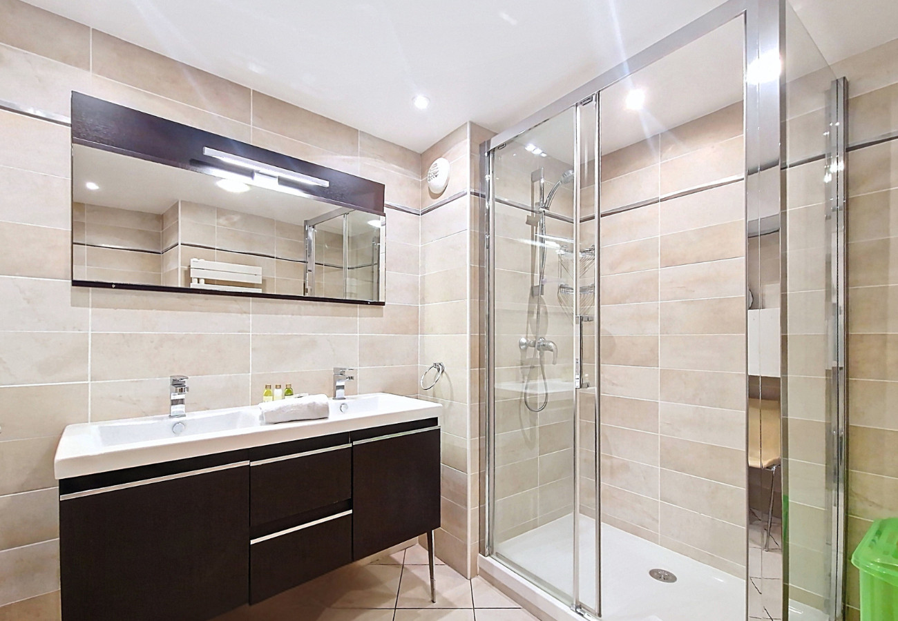 La salle de bain propose une agréable douche, un sèche-serviettes, un sèche-cheveux ainsi que des WC.