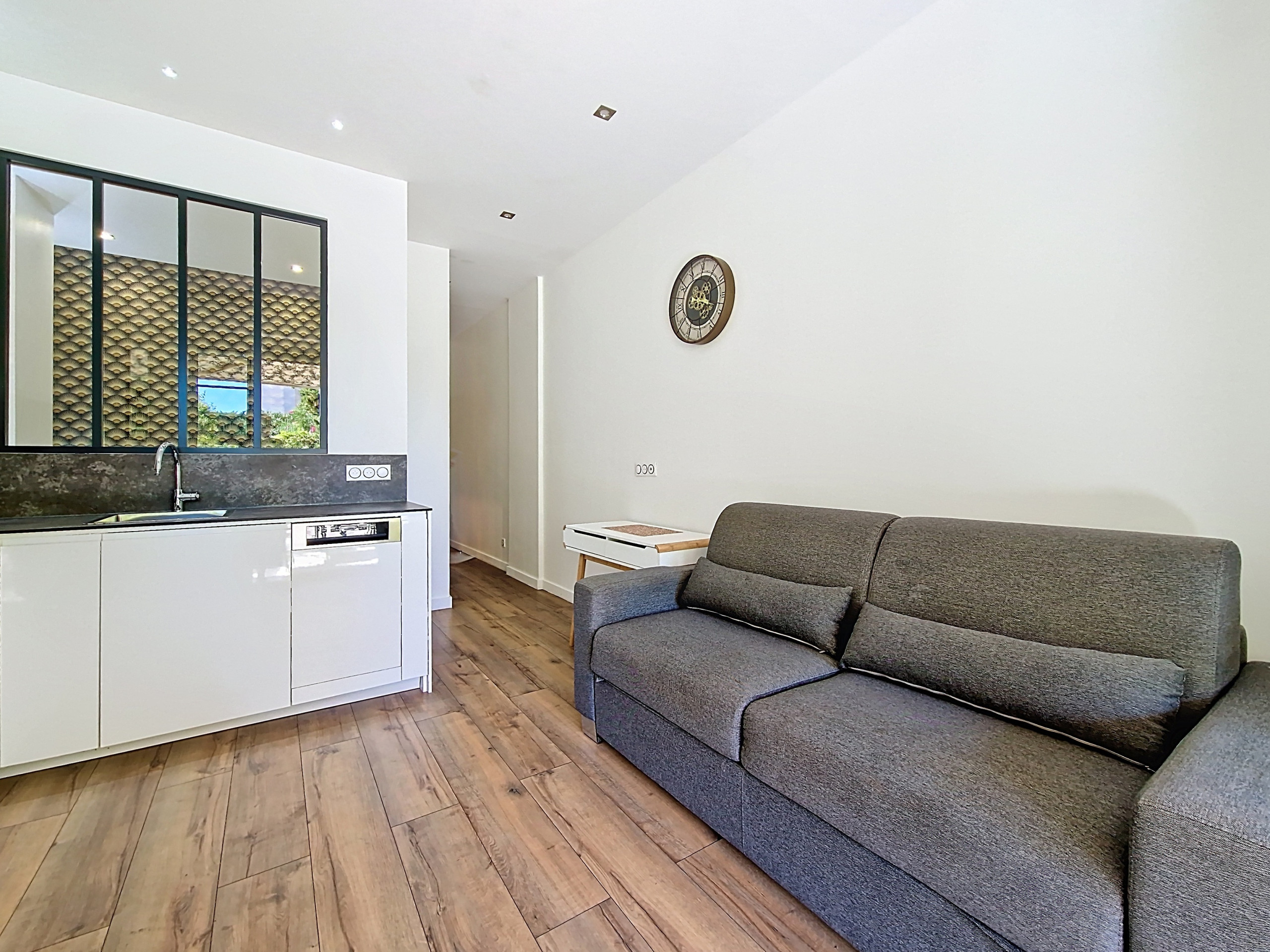 Ce 2 pièces climatisé offre un séjour lumineux avec coin repas et cuisine équipée, un espace nuit avec lit double, ainsi qu’une salle de bain moderne.